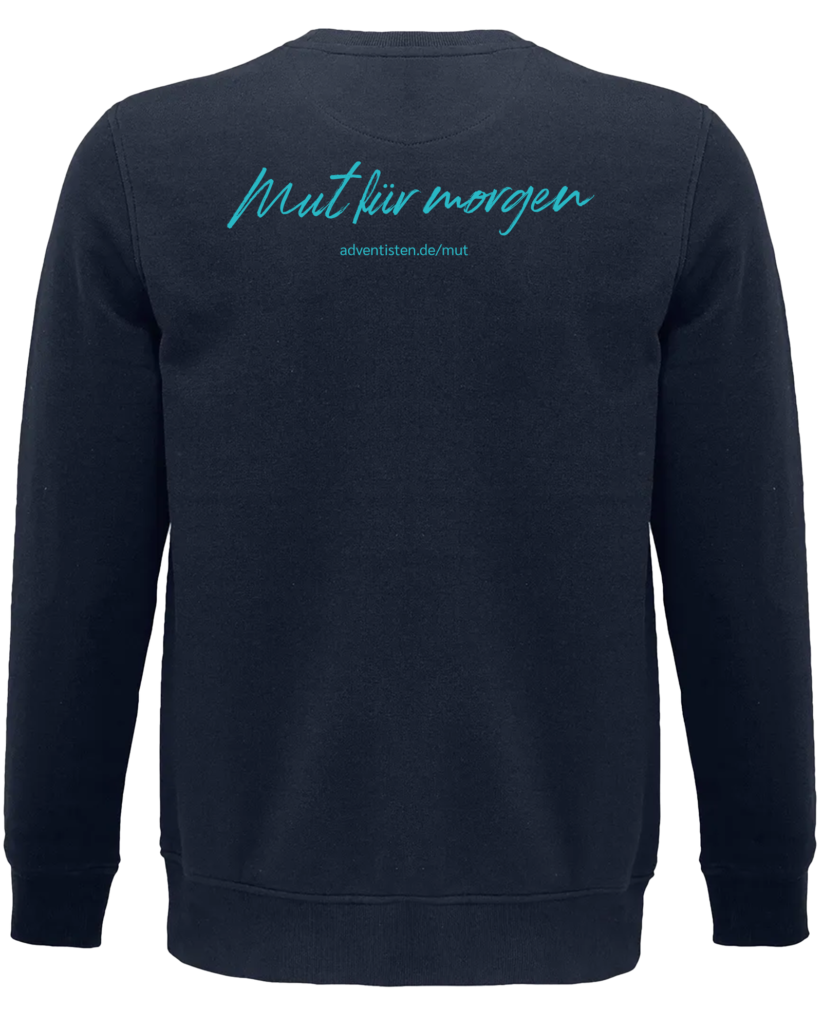 Auf der Vorderseite befindet sich ein kleines Adventgemeinde-Logo auf der Brust, das im hochwertigen Siebdruckverfahren aufgebracht ist. Der Rücken wird von einem großen, klaren Print „Mut für morgen“ geprägt – ebenfalls im hochwertigen Siebdruck, langlebig und farbintensiv.