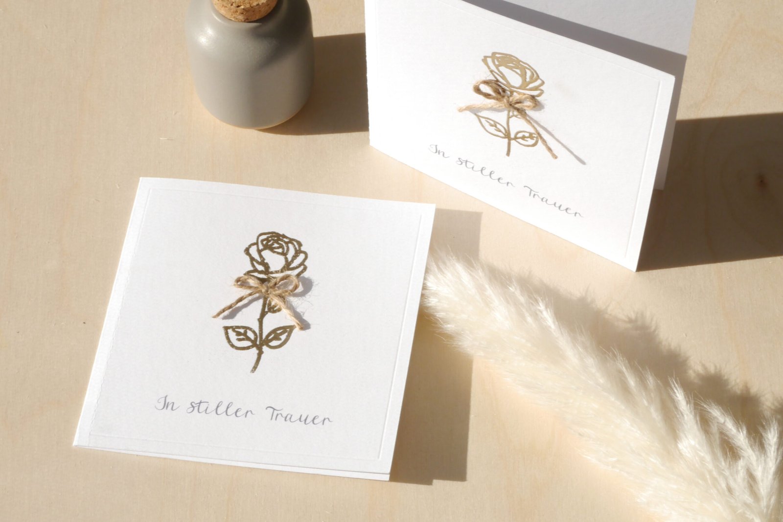 In schweren Momenten fehlen oft die richtigen Worte. Diese handgefertigte Trauerkarte bietet einen würdevollen Rahmen, um Anteilnahme und Mitgefühl auszudrücken.
